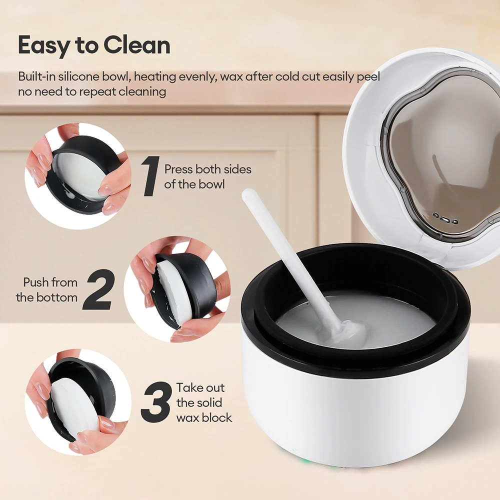 3.Easy to Clean. Built-in silicone bowl, heating evenly, wax after cold cut easily peel, no need to repeat cleaning, say goodbye to tedious steps.