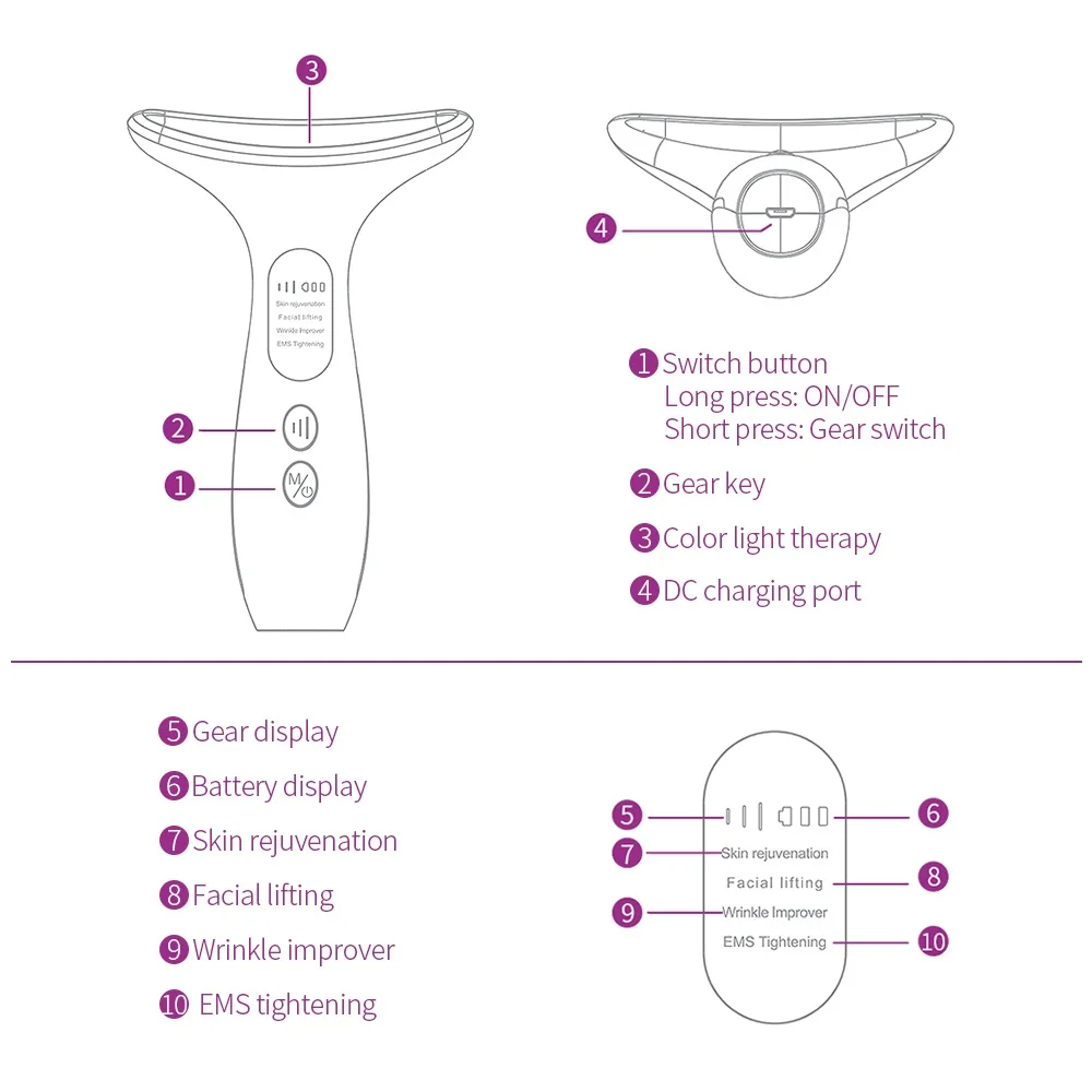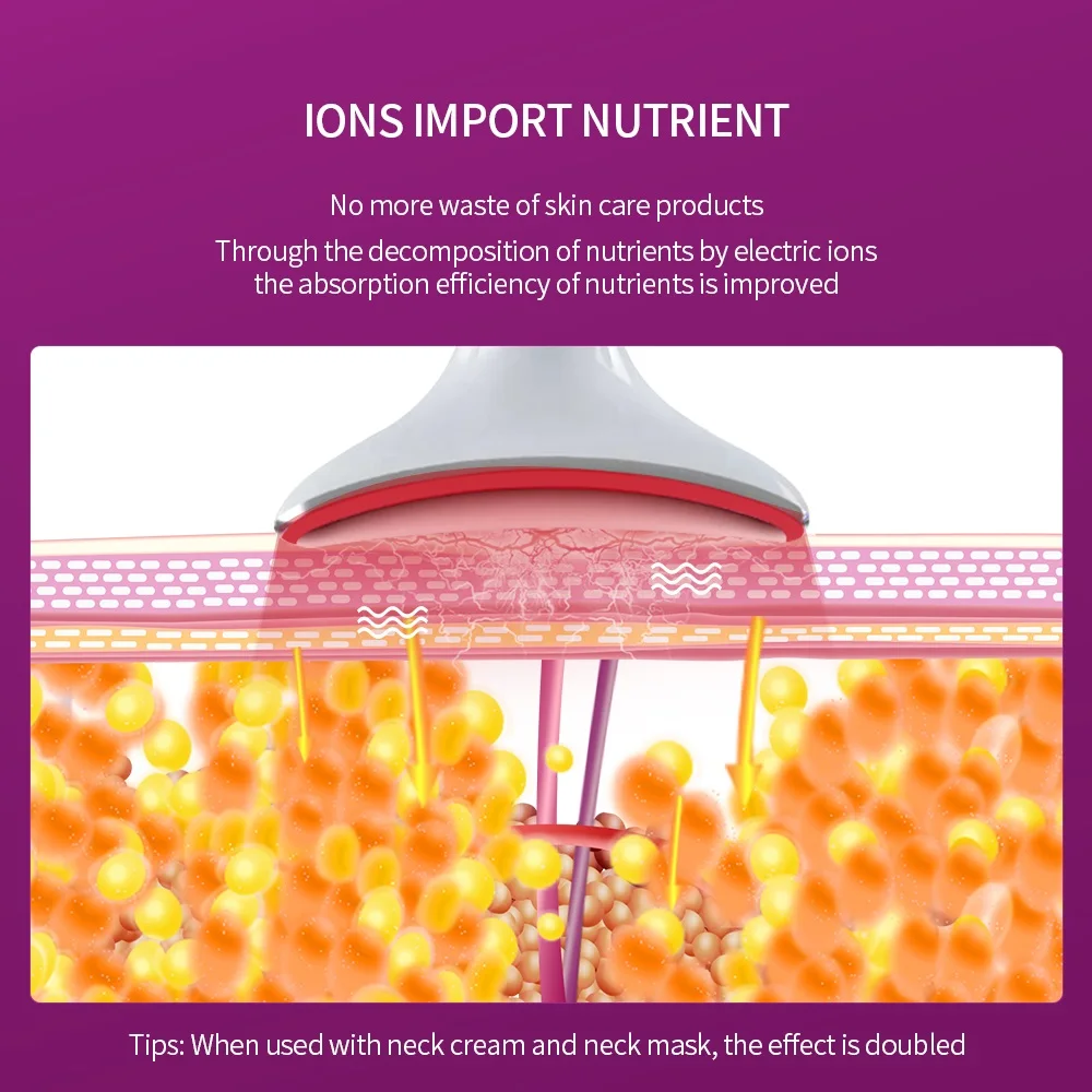 1. Color light care: Red light Facial firming, Blue light rejuvenation,Purple light balance 2. Firming: Activate skin elasticity 3. Temperature sensing pull up: Compact V face against early aging 4. ions import Nutrient. No more waste of skin care products. Through the decomposition of nutrients by electric ions, the absorption efficiency of nutrients is improved.